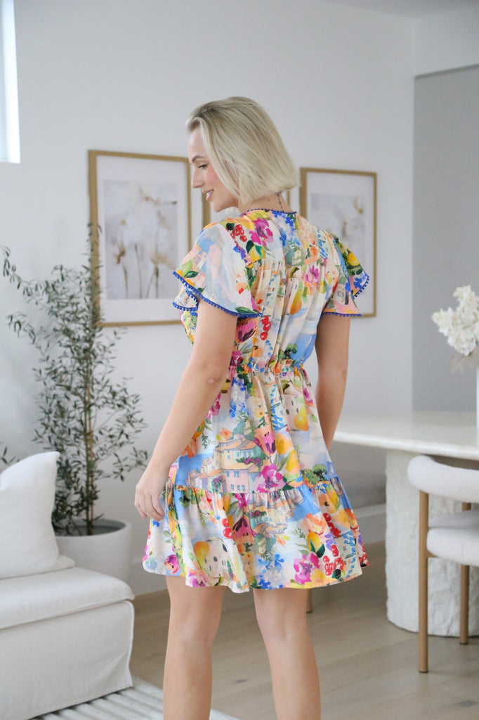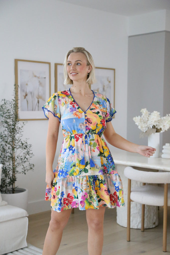 Pretty mediteranean printed dress with buttons down the front to a tie waist. Flutter sleeves. Rayon. Cold hand wash.