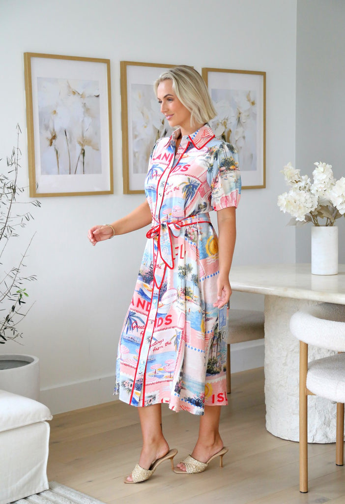Beautiful printed midi dress with red details and buttons down the front. Belt loops with tie belt. Rayon. Cold hand wash.