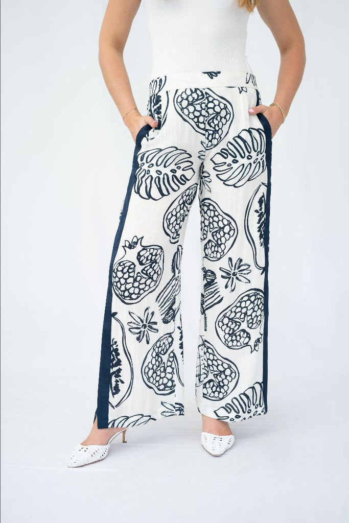 Fun exotic fruit print pants with navy contrast tape on the sides. Cold hand wash. Pairs well with the Exotic Fruit Shirt.