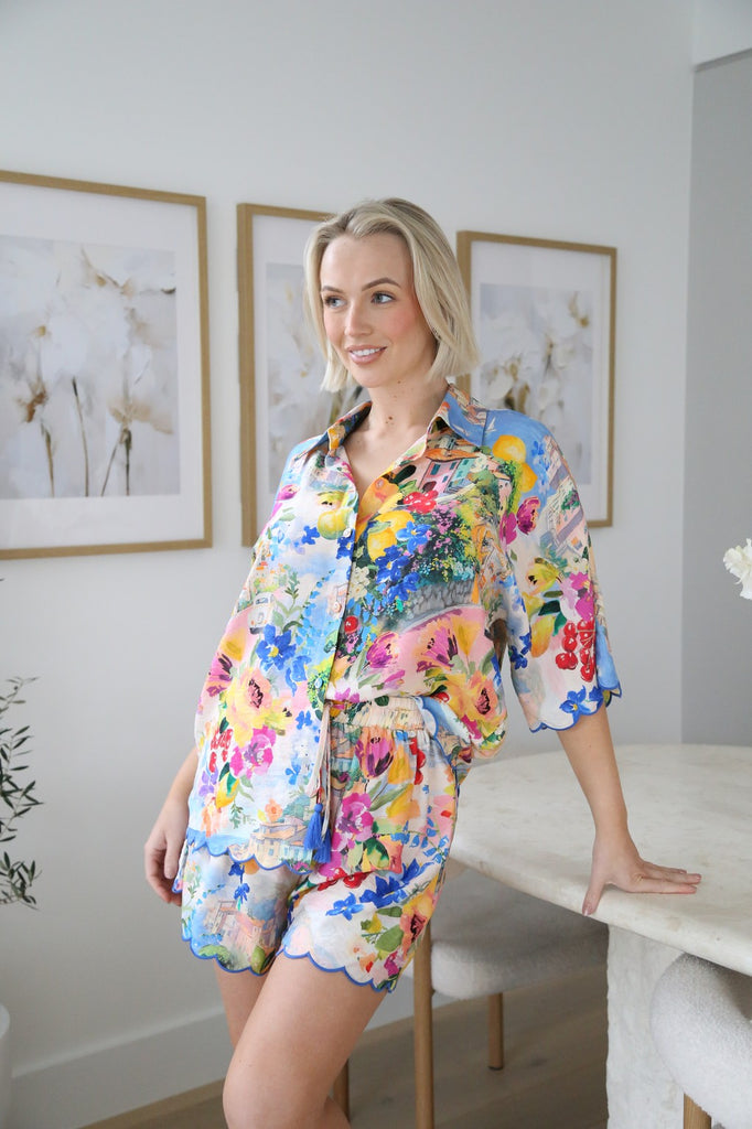 Cute little printed shorts with an elastic waist and scallop edging. Rayon. Cold hand wash.